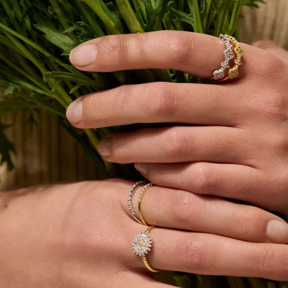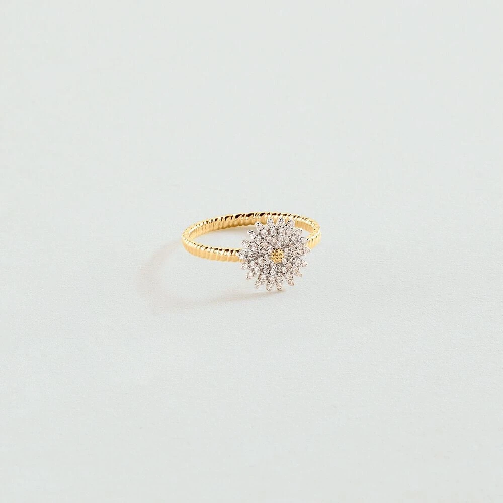 Bague en laiton doré à l’or 750/1000 montée d’un fleur printanière pavée d’oxydes de zirconium.