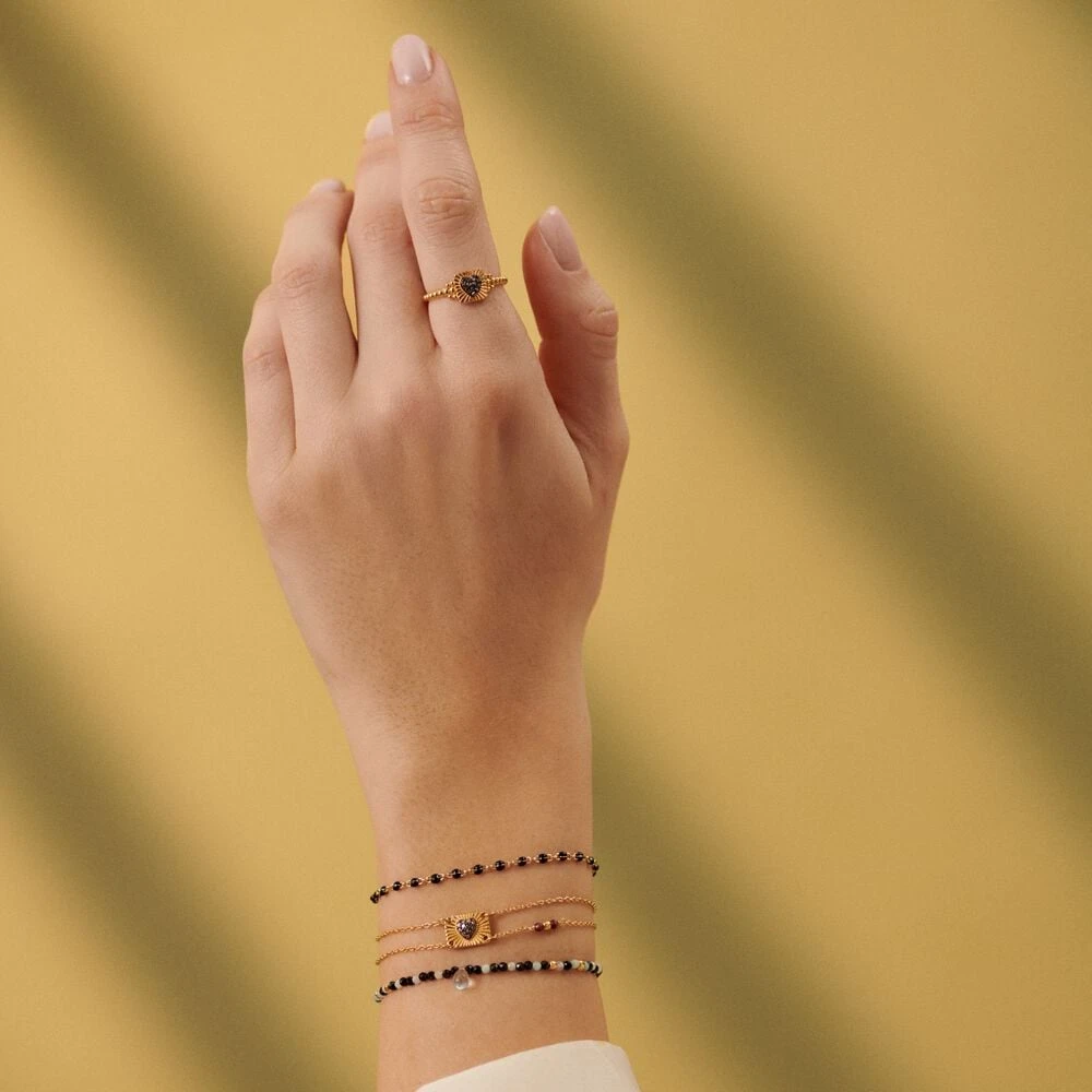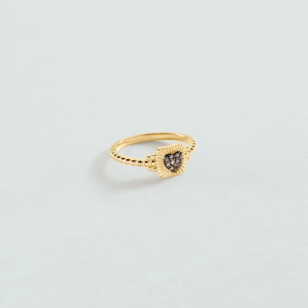 Bague fine, en argent doré 750/1000 et ruthénium, médaille carrée avec un coeur pavé de diamants bruns.