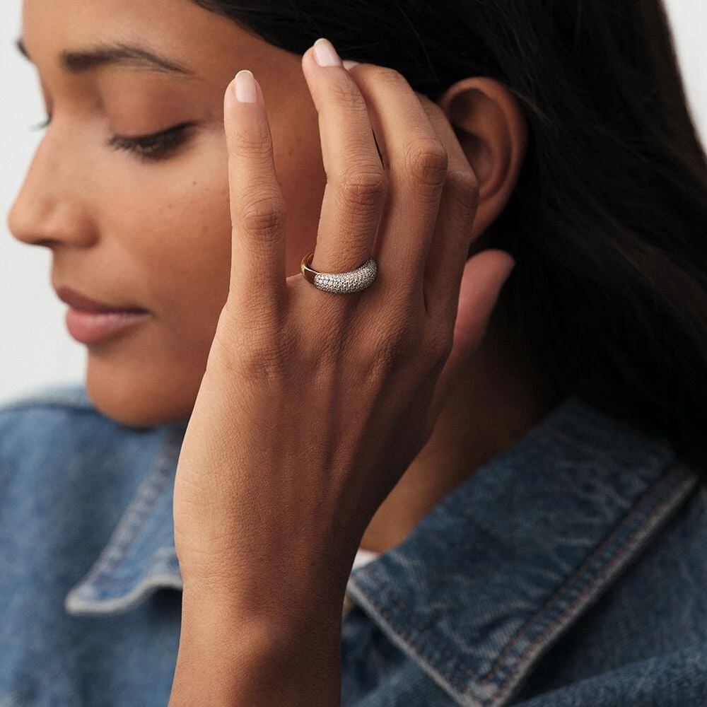 Bague en argent 925/1000 doré à l’or 750/1000 avec des griffe en ruthénium pavé d’une multitude d’oxyde de zirconium.