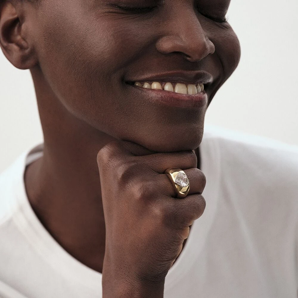 Bague bombée, en laiton doré 750/1000, oxyde de zirconium en forme de coeur souligné par une bordure en laiton rhodié.