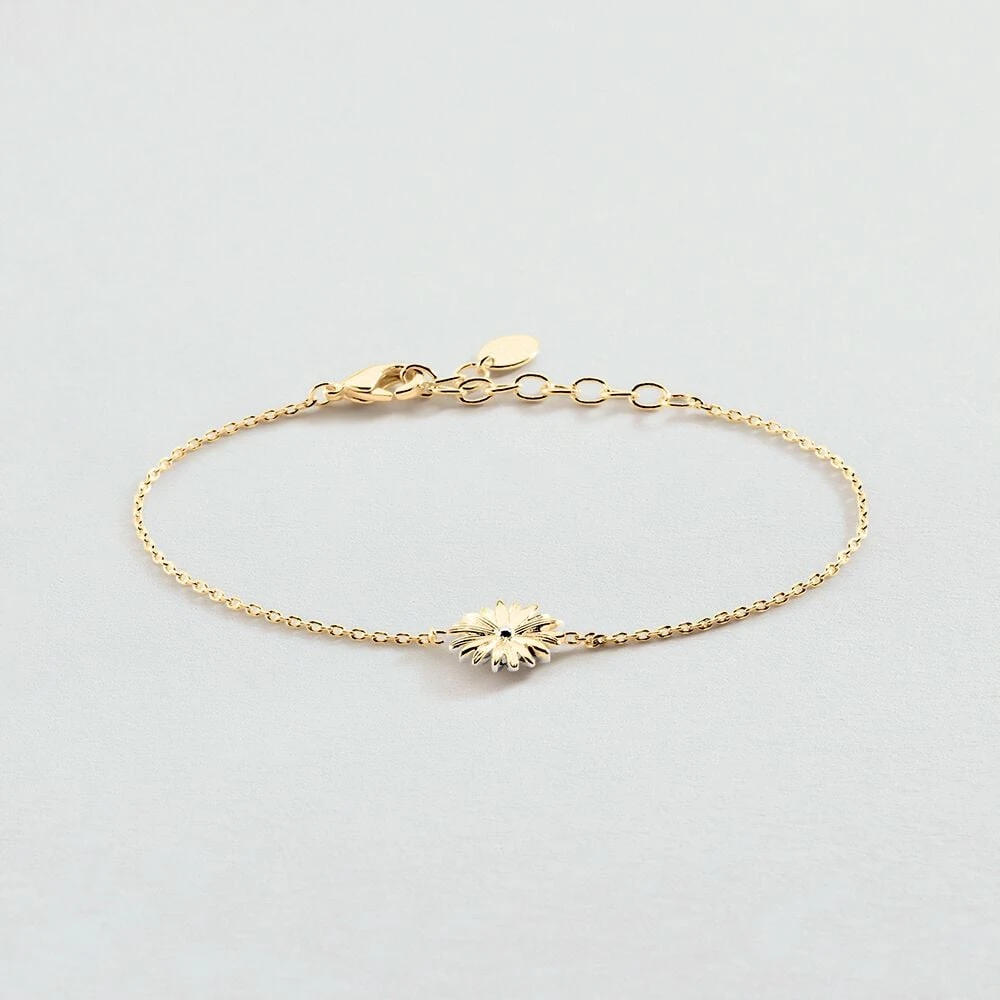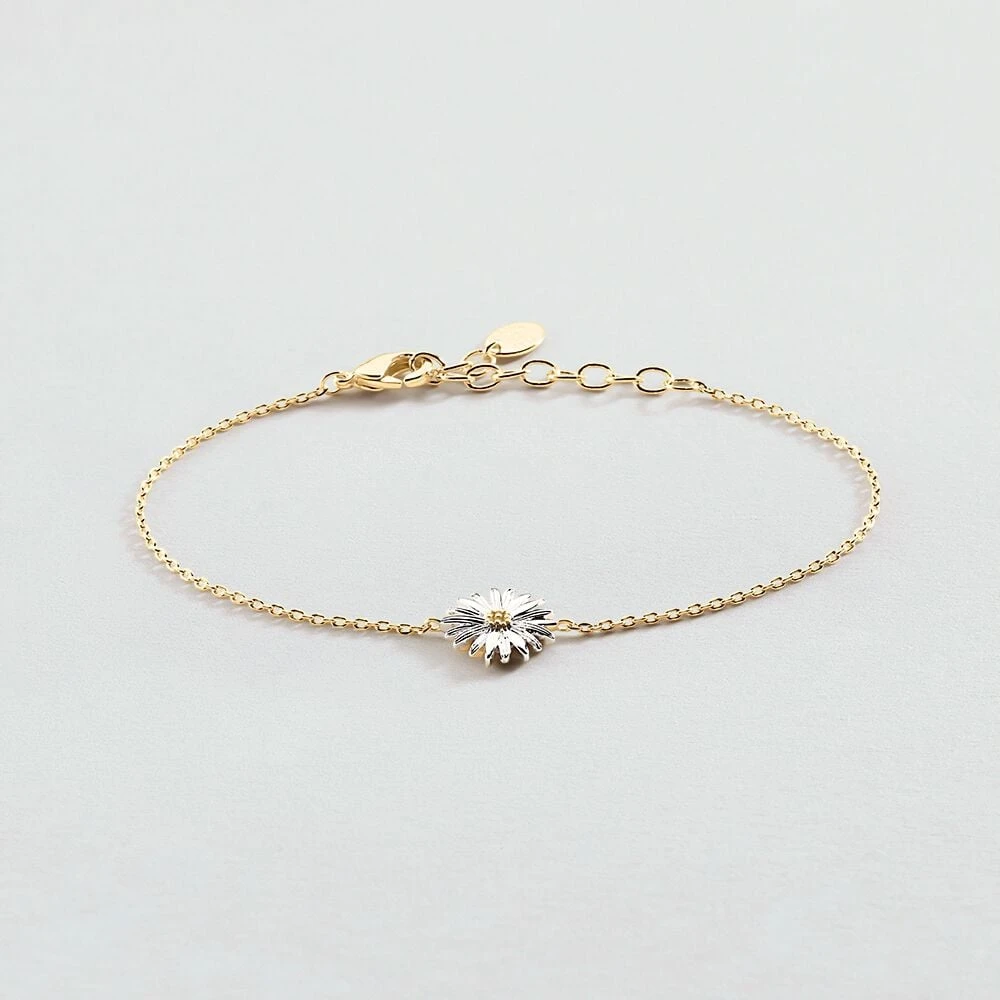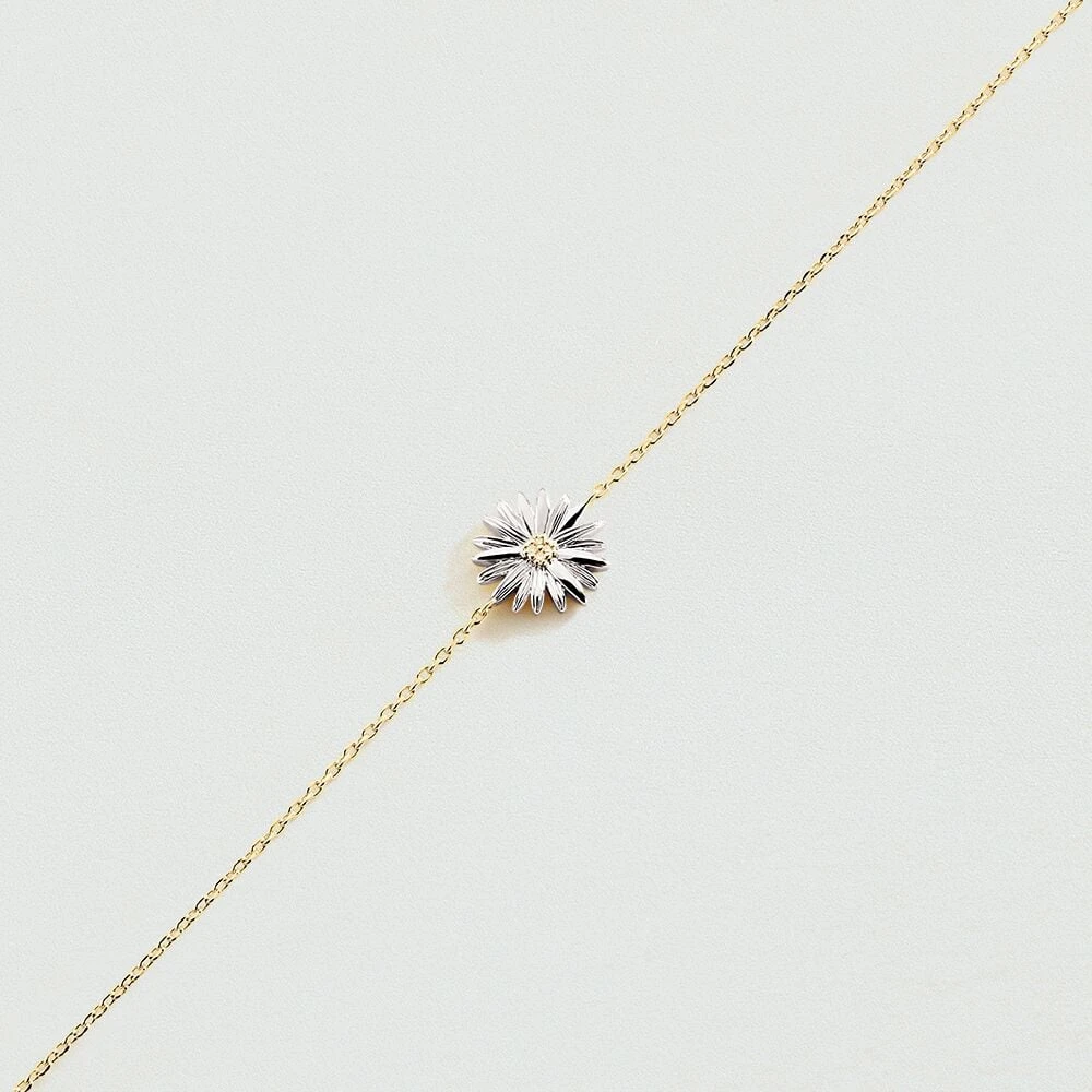 Bracelet en laiton doré à l’or 750/1000 et rhodié. Ce bracelet est centré d’une délicate fleur bicolore pouvant se porter du côté argenté comme du côté doré selon vos envies ! . Ce bijou mesure 150mm et contient une rallonge de 30mm