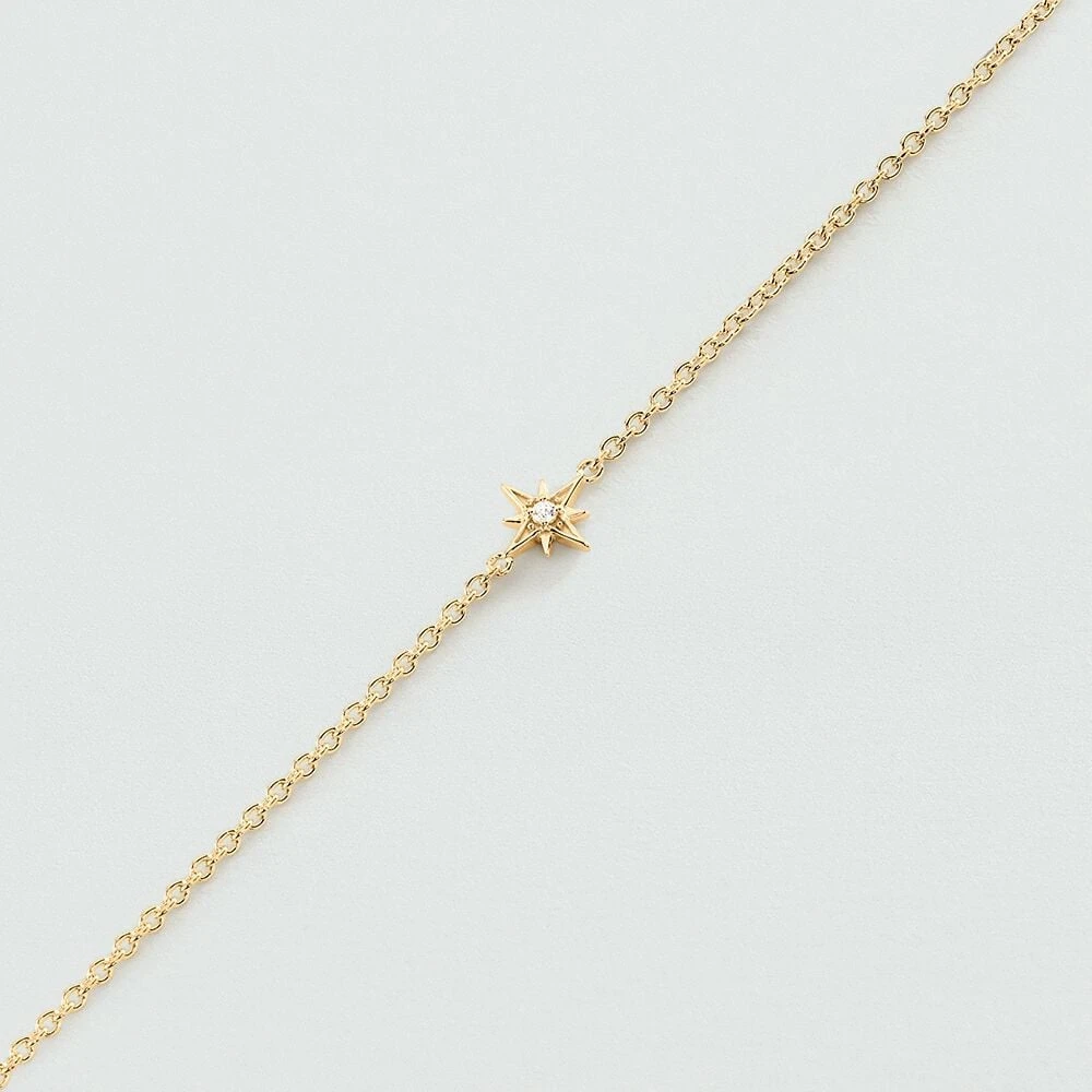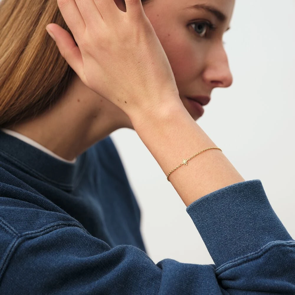 Bracelet étoile, en argent véritable doré 750/1000, serti d’un oxyde de zirconium. Ce bijou mesure 145mm et contient une rallonge de 30mm