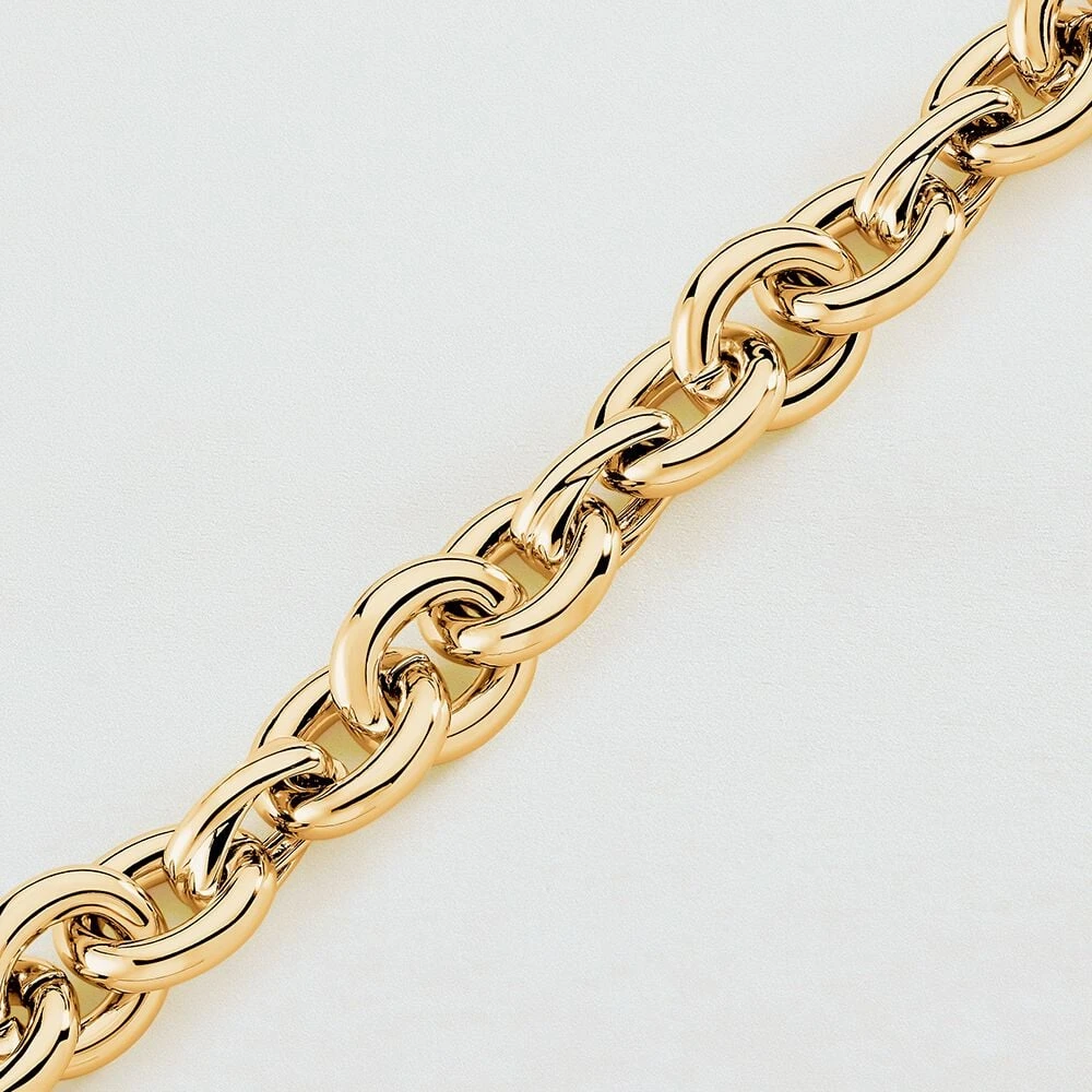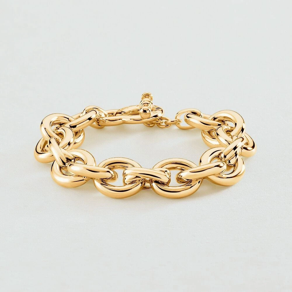 Bracelet maille en laiton doré à l’or 750/1000. Une maille avec de gros anneaux dont un en forme de X ainsi qu’un fermoir T-barre. .
