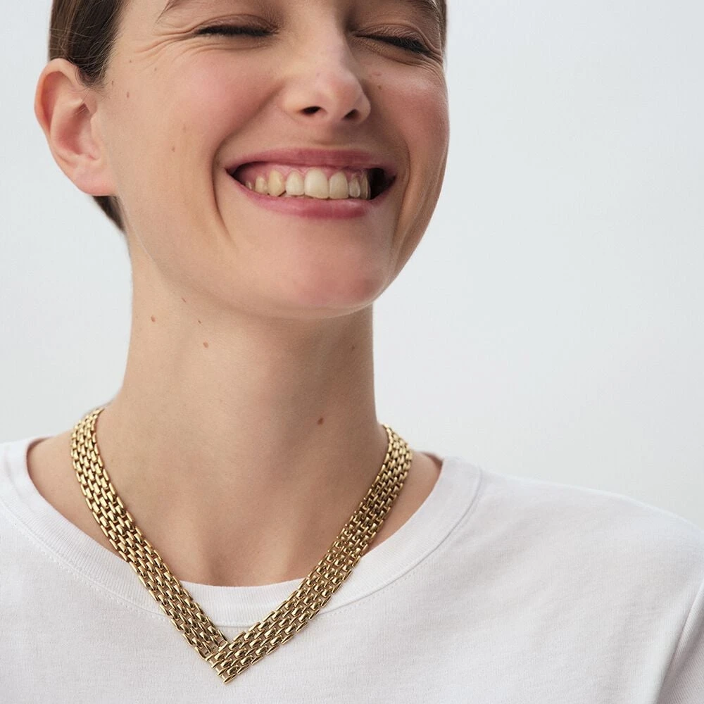 Collier de forme V, en laiton et étain, dont la maille ressemble à une maille de montre. Ce bijou mesure 450mm et contient une rallonge de 50mm