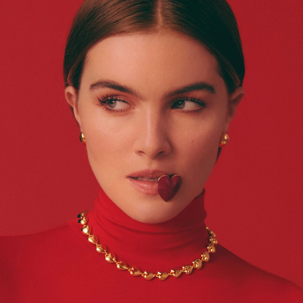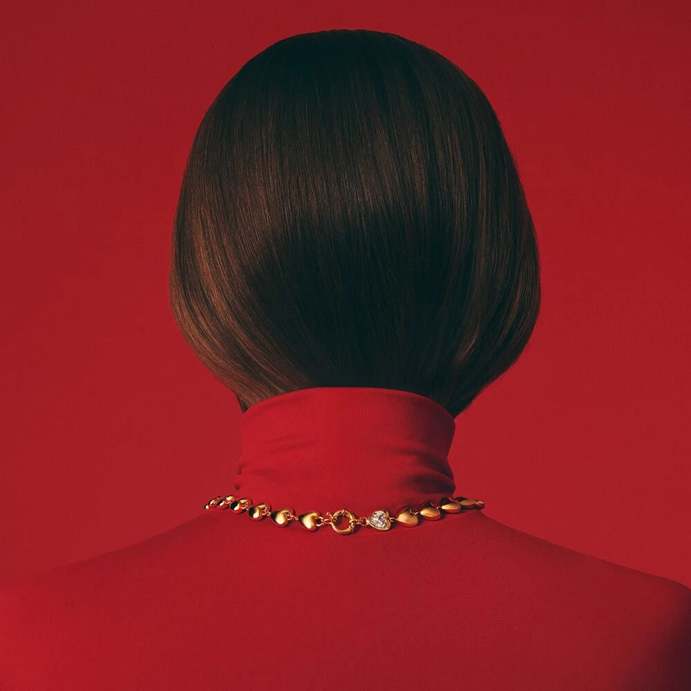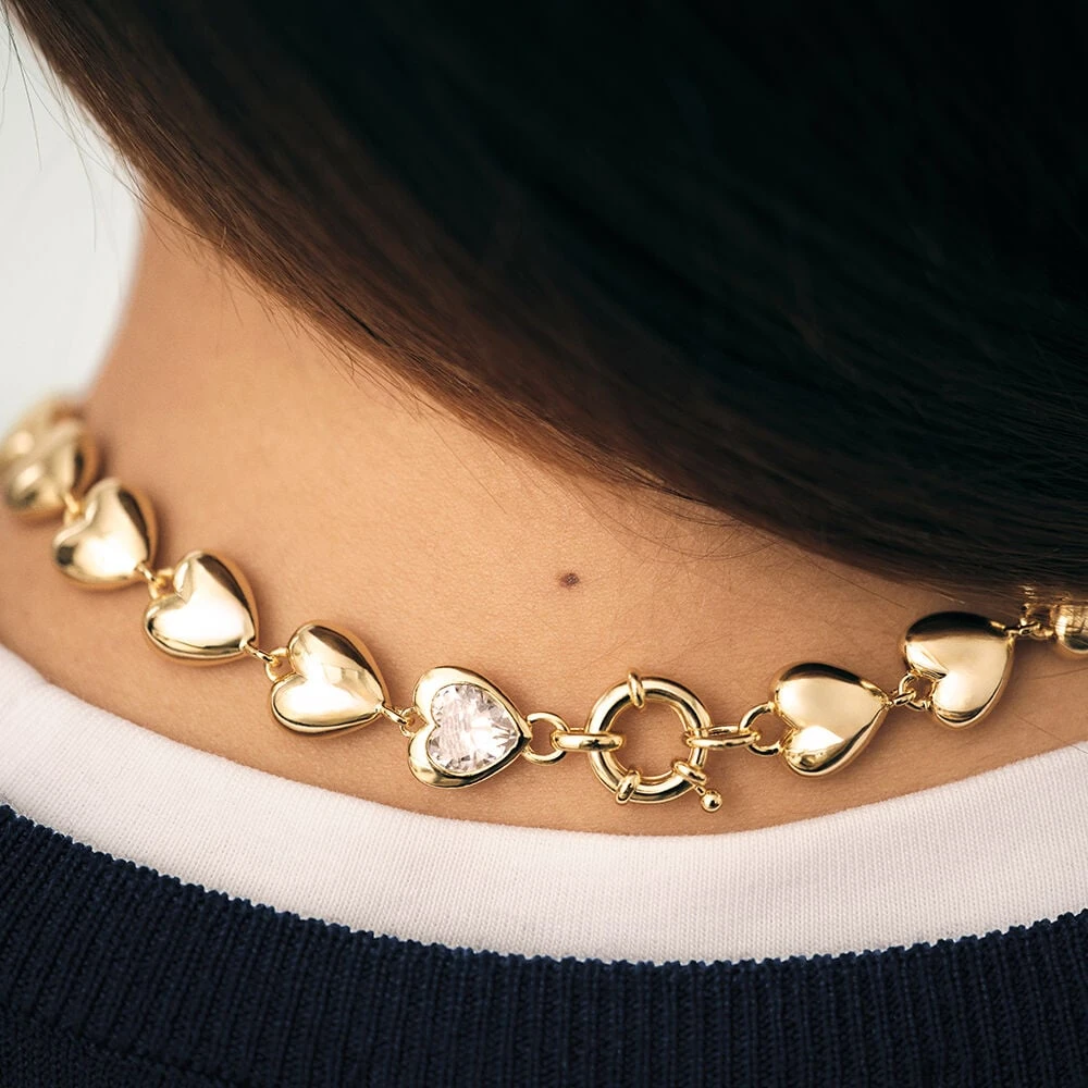 Collier en laiton doré, orné d’un rang de cœurs en métal et d’un cœur en oxyde de zirconium scintillant.