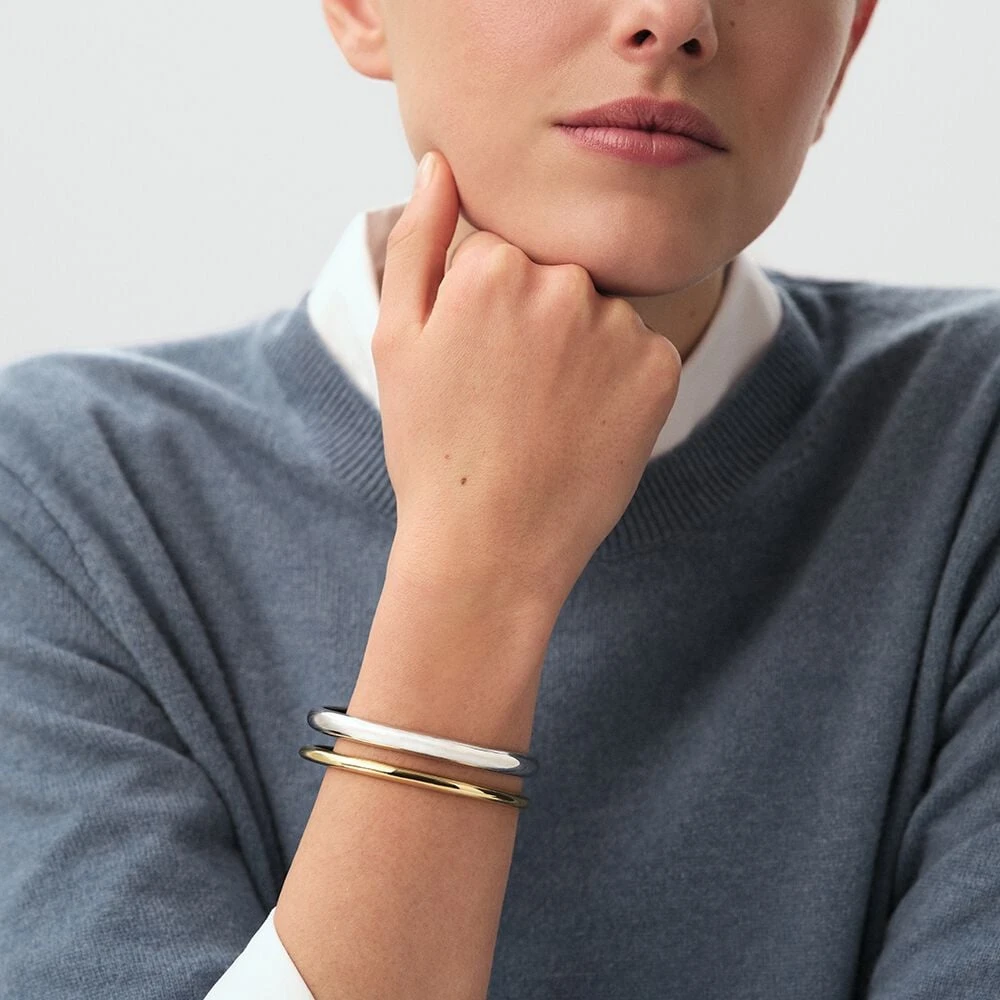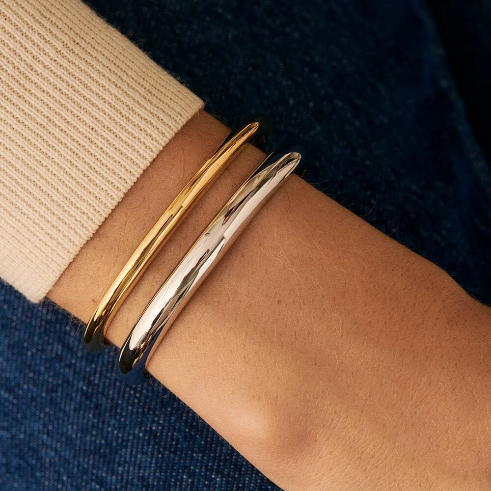 Jonc en argent rhodié et doré à l’or 750/1000. Les deux placages séparés donnent l’illusion d’avoir deux bracelets. .