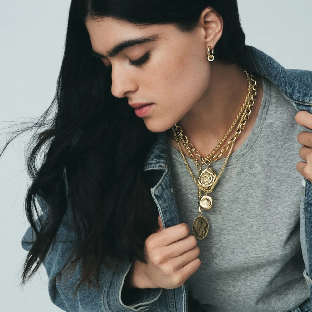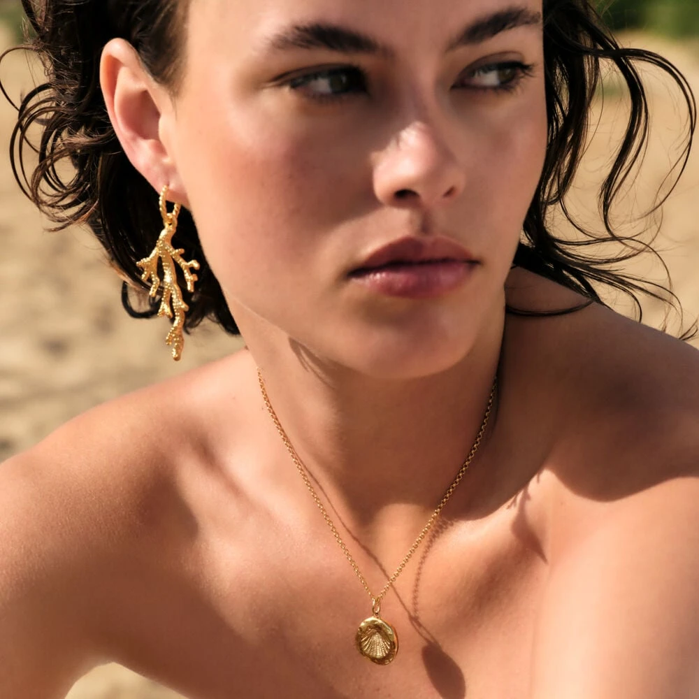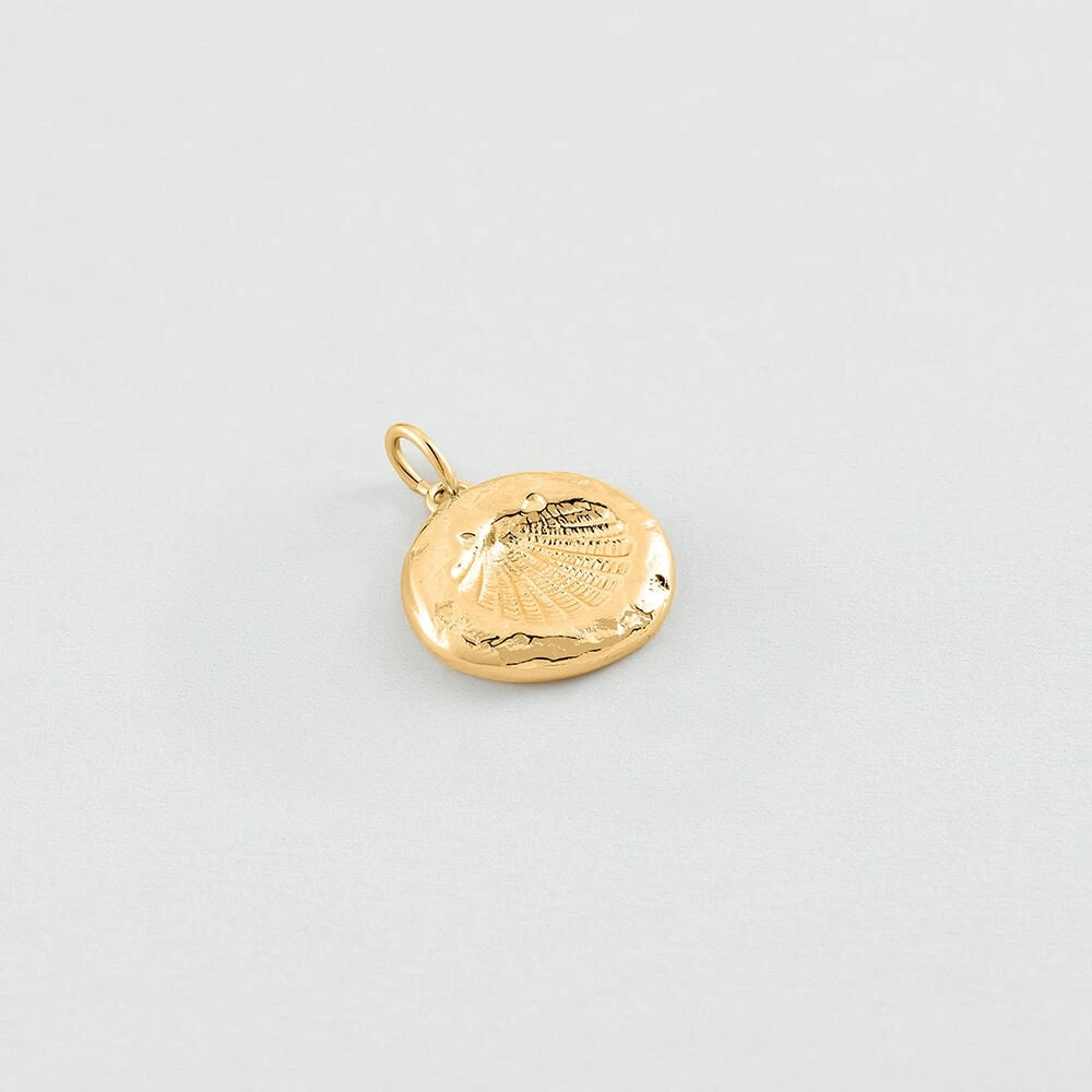 Médaille coquillage imprimé modelée à la main en étain doré à l’or 750/1000. Créez votre bijou unique et personnalisé en l’associant à d’autres pendentifs charms et à la chaîne de votre choix.