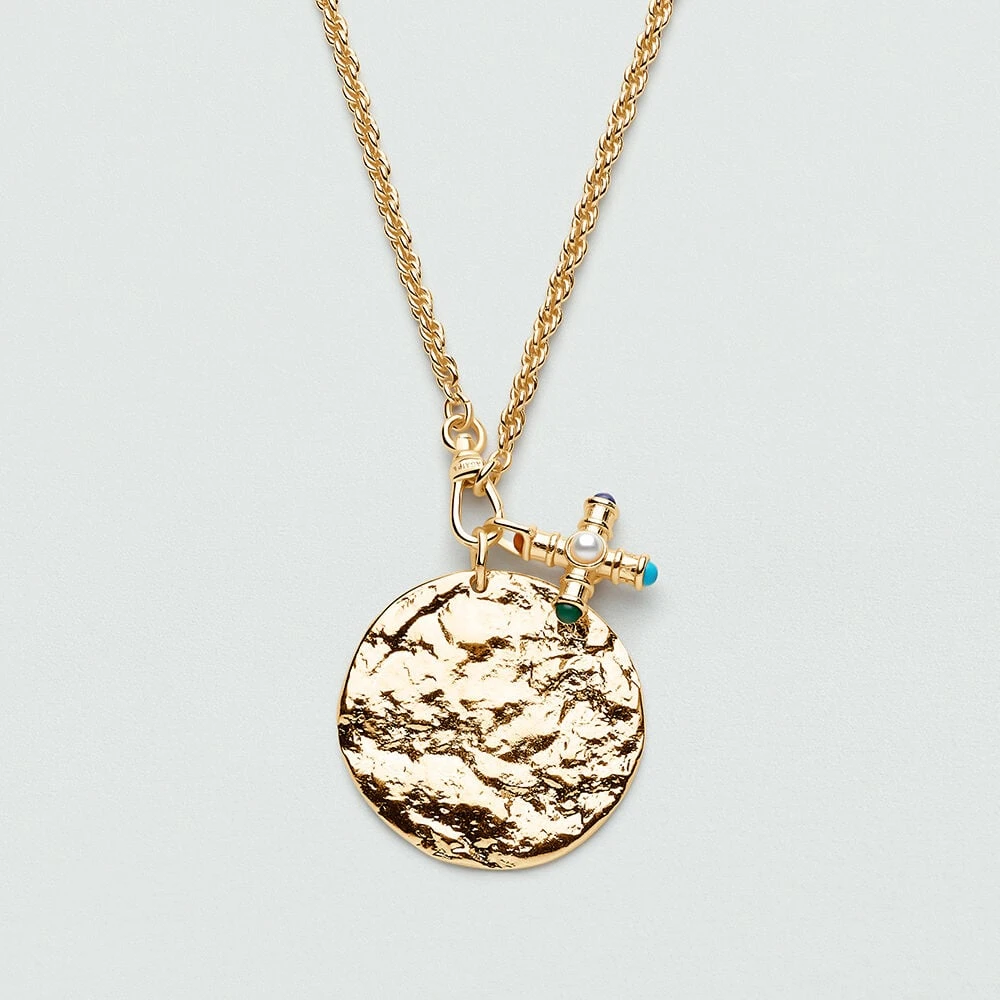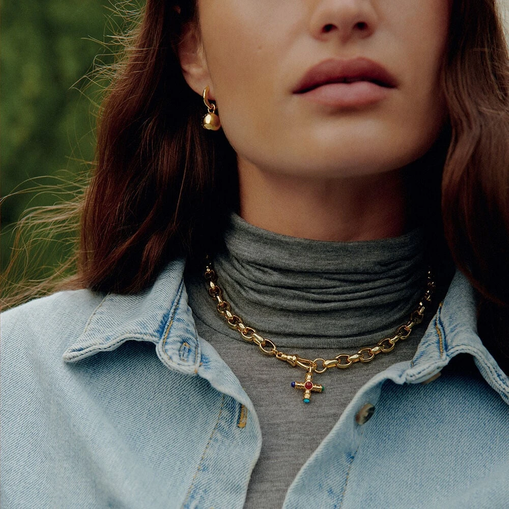 Pendentif charm en laiton doré à l’or 750/1000 en forme de croix munie de différentes pierres naturelles. Créez votre bijou unique et personnalisé en l’associant à d’autres pendentifs charms et à la chaîne de votre choix..