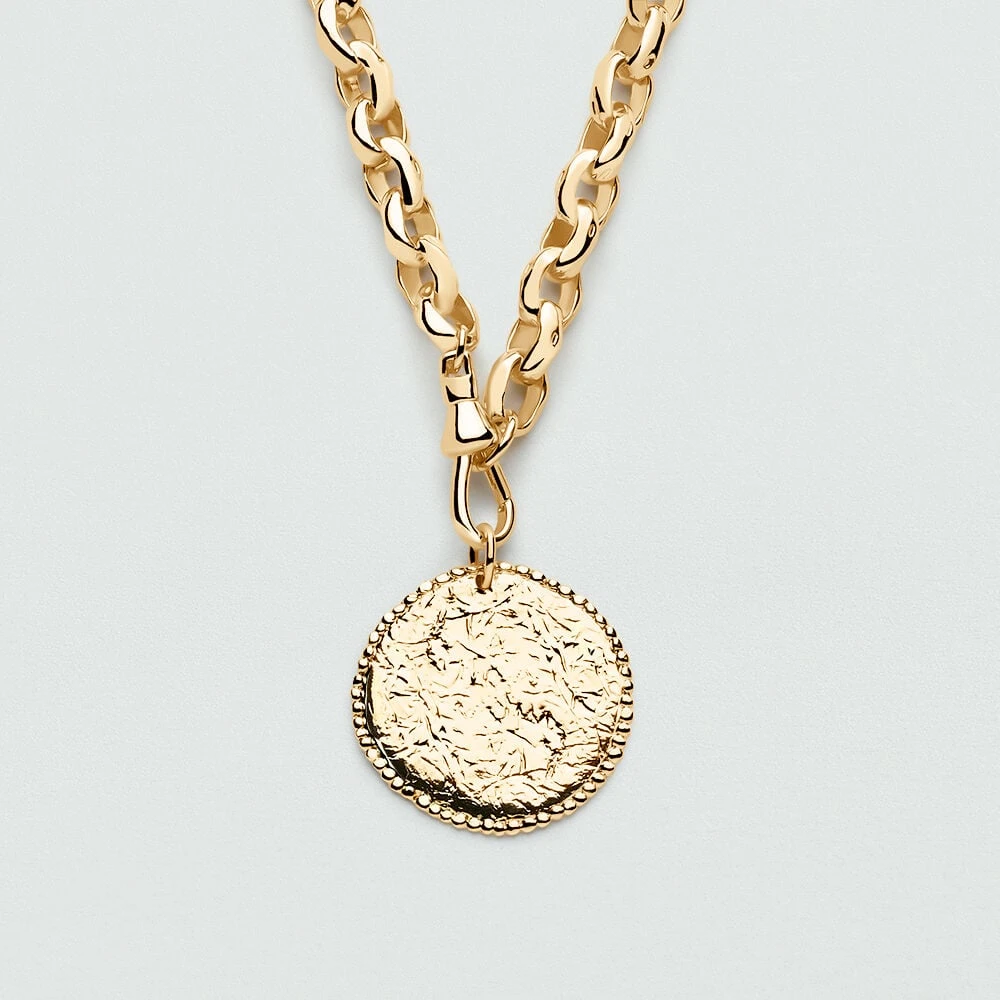 Médaille texturée modelée à la main en étain doré à l’or 750/1000. Créez votre bijou unique et personnalisé en l’associant à d’autres pendentifs charms et à la chaîne de votre choix.