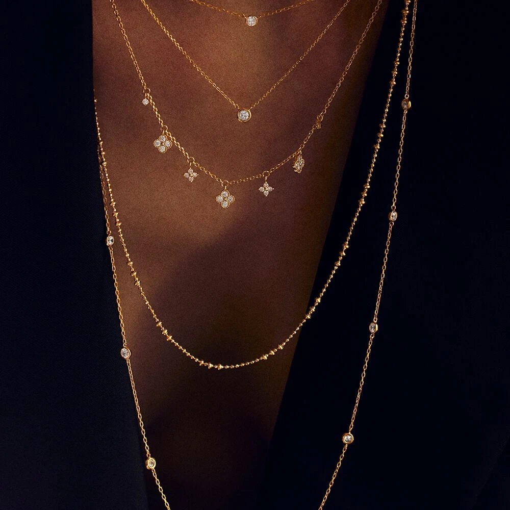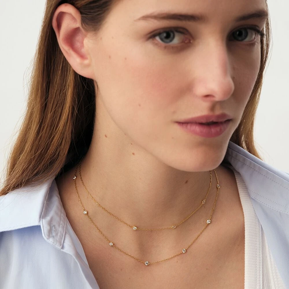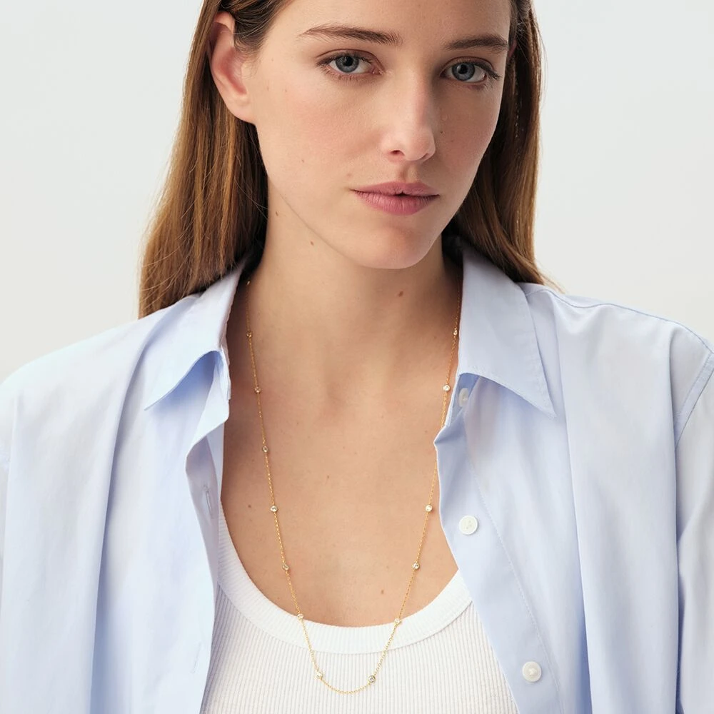 Sautoir en argent 925/1000 doré à l’or 750/1000 serti d’une multitude d’oxydes de zirconium. . Ce bijou mesure 700mm et contient une rallonge de 50mm