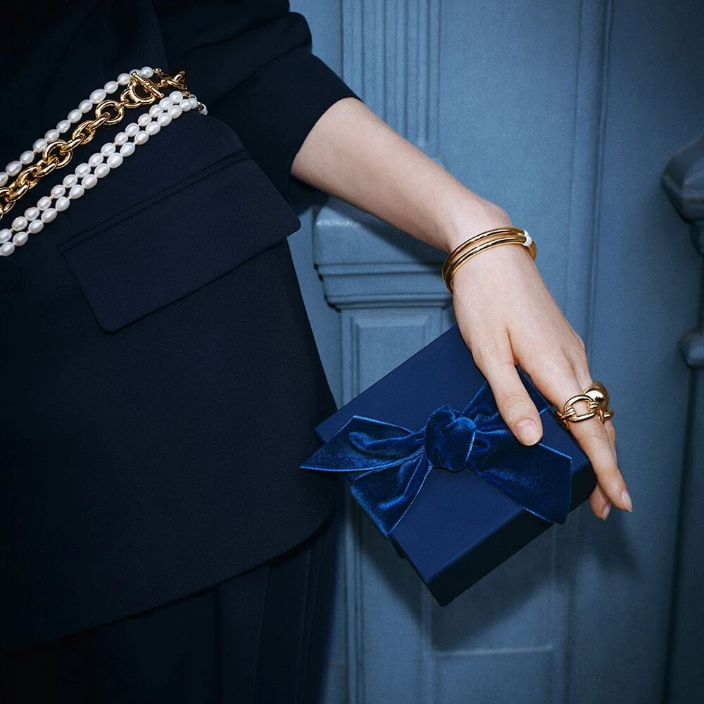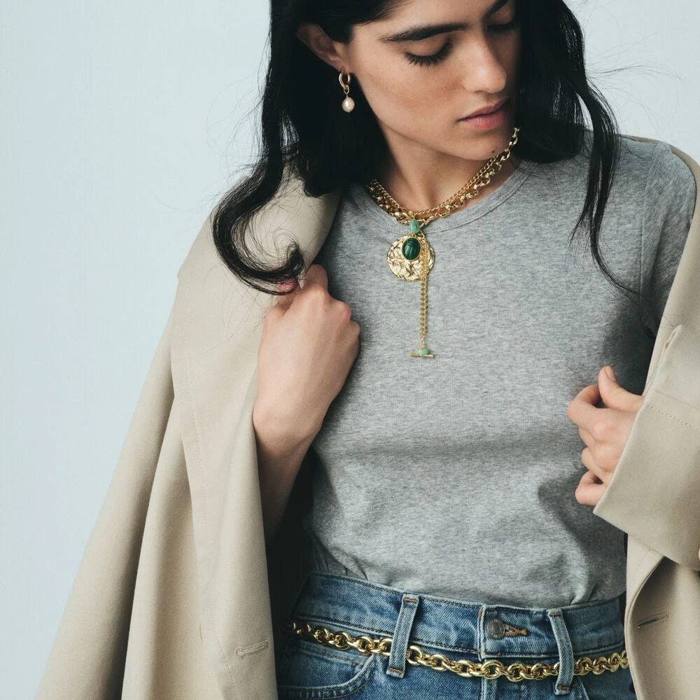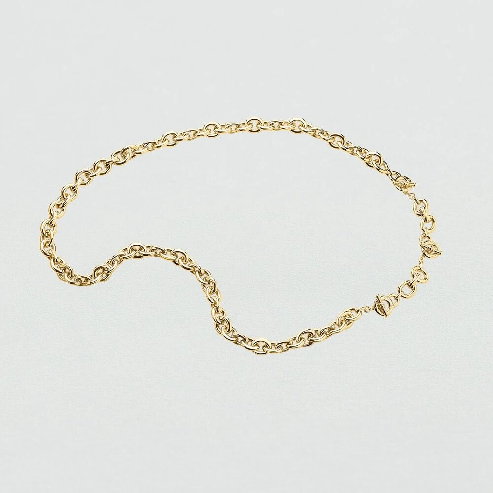 Collier long maillon en laiton doré 750/1000 pouvant se porter également en ceinture. Ce bijou mesure 840 mm de long et contient 2 rallonges distinctes de 80mm de long chacune.